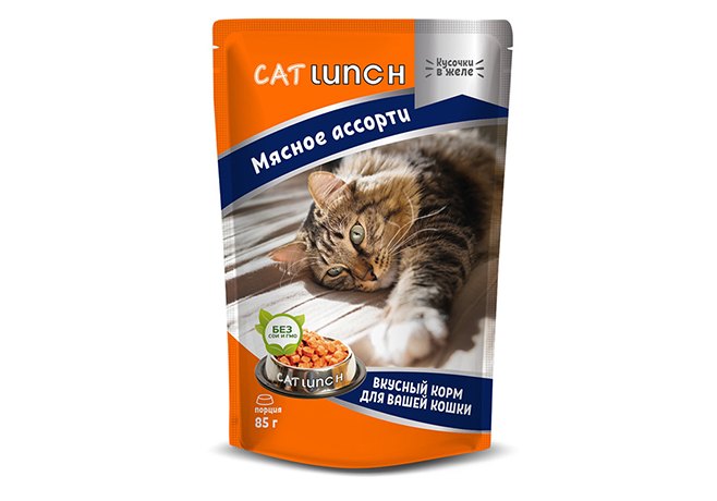 Cat Lunch Паучи Кэт Ланч для кошек кусочки в желе Мясное ассорти (цена за упаковку) 85г х 24шт