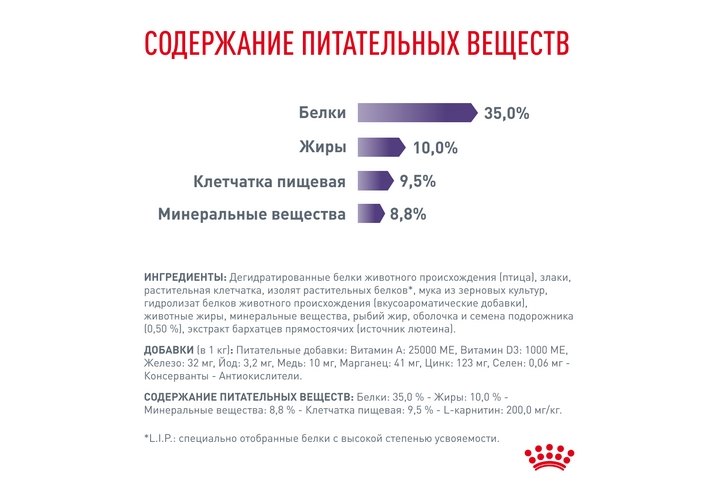 Белки: 35,0 % - Жиры: 10,0 % - Зола: 8,8 % - Клетчатка пищевая: 9,5 % - L-карнитин: 200,0 мг/кг.