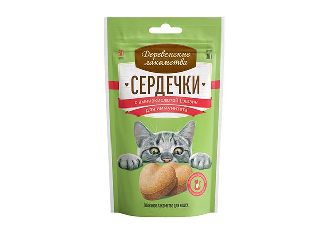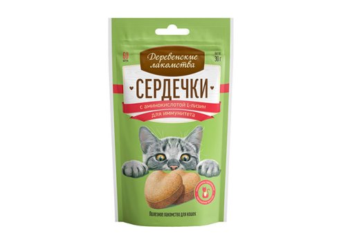 Деревенские лакомства Сердечки для кошек с аминокислотой L-лизин для Иммунитета 30 г