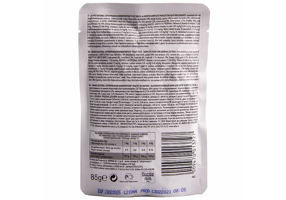 Monge Monoprotein Kitten Trout Влажный корм Паучи Монж для Котят Форель (цена за упаковку) 85г х 28шт