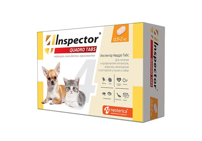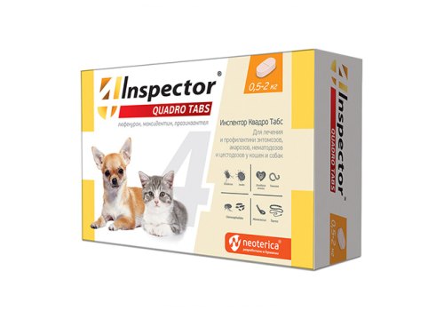 Inspector Quadro Tabs Таблетки Инспектор от Внешних и Внутренних паразитов для кошек и собак весом от 0,5 до 2 кг 1 х 4шт
