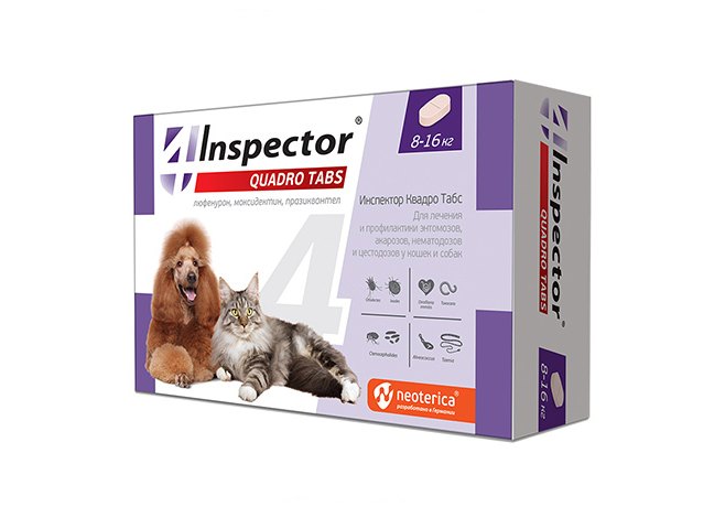 Inspector Quadro Tabs Таблетки Инспектор от Внешних и Внутренних паразитов для кошек и собак весом весом от 8 до 16 кг 1 х 4шт