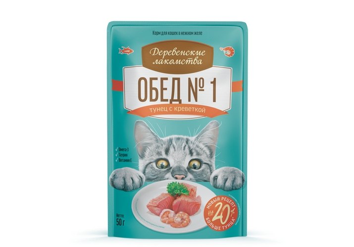 Деревенские лакомства Паучи для кошек Обед №1 для кошек Тунец с креветкой в нежном желе (цена за упаковку) 50г х 12шт