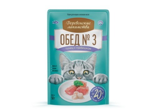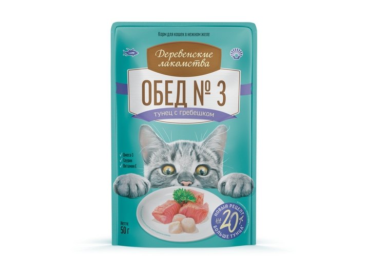 Деревенские лакомства Паучи для кошек Обед №3 для кошек Тунец с гребешком в нежном желе (цена за упаковку) 50г х 12шт