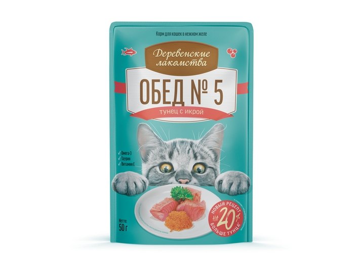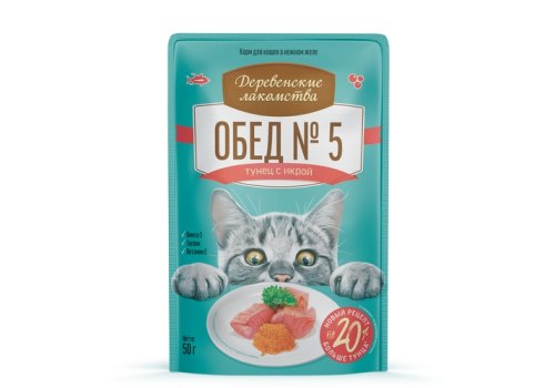 Деревенские лакомства Паучи для кошек Обед №5 для кошек Тунец с икрой в нежном желе (цена за упаковку) 50г х 12шт