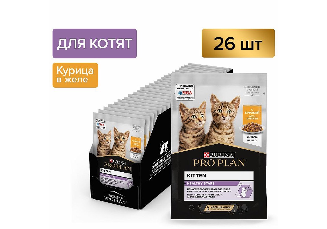 Команда квалифицированных ветеринарных специалистов разработала влажный корм PURINA® PRO PLAN® HEALTHY START для здорового развития котенка. Этот полнорационный корм для кошек с курицей подходит для повседневного кормления питомцев в возрасте до 12 месяцев, а также беременных и кормящих кошек.