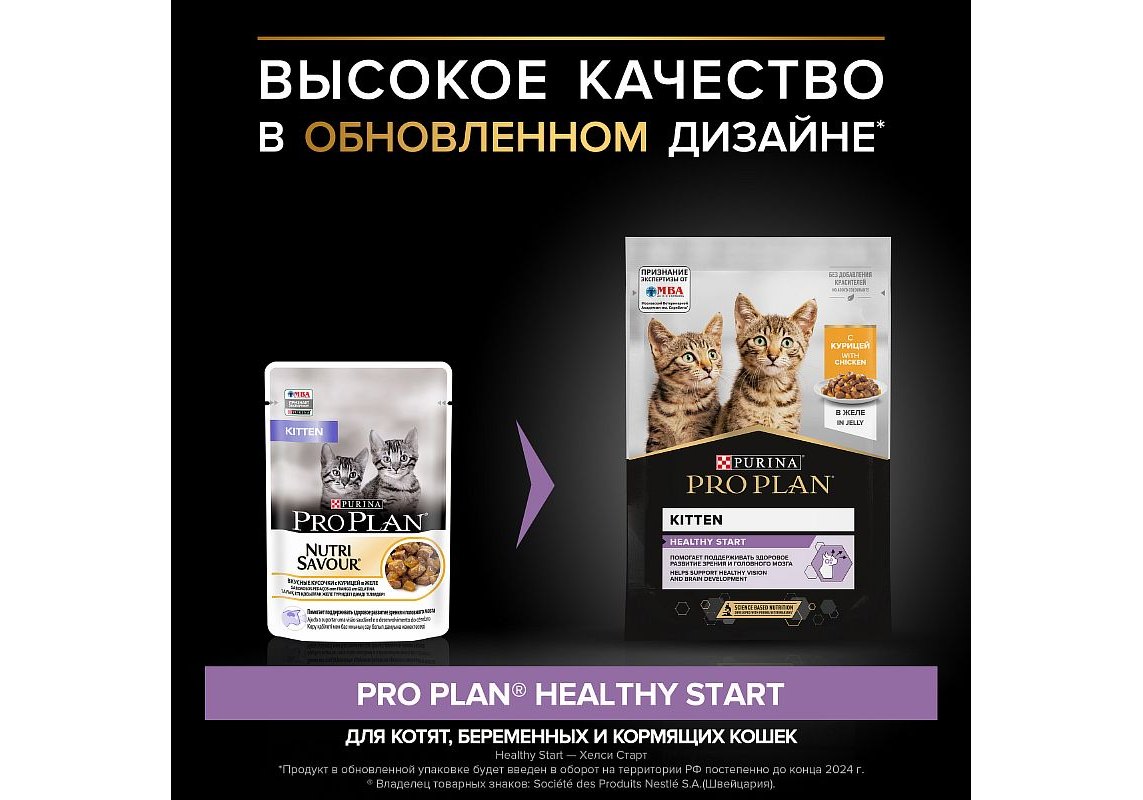 Влажный корм для котят PURINA® PRO PLAN® HEALTHY START (Здоровый старт для котят) — это полюбившийся PRO PLAN® NUTRISAVOUR® KITTEN с новым названием, но с прежним составом и качеством.