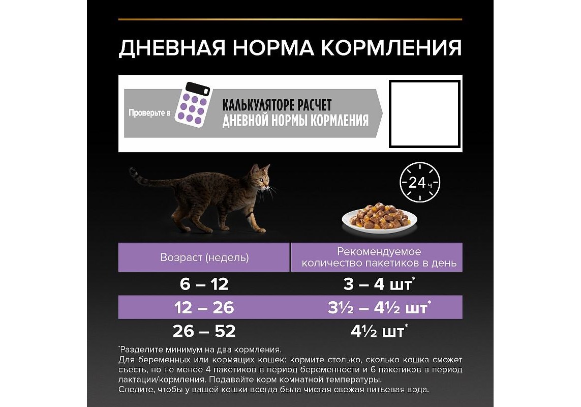 Каждый котенок развивается по-своему, поэтому количество корма и/или время кормления могут быть скорректированы в зависимости от уровня его активности и роста. Для беременных или кормящих кошек: кормите столько, сколько кошка сможет съесть, но не менее 3 пакетиков во время беременности и 5 пакетиков в период лактации/кормления.