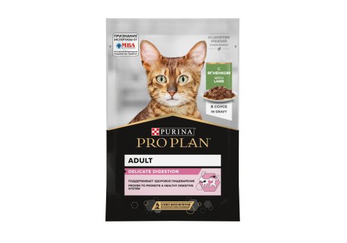 PRO PLAN DELICATE Влажный корм Паучи ПРО ПЛАН для взрослых кошек при чувствительном пищеварении с ягненком в соусе (цена за упаковку) 85г х 26шт