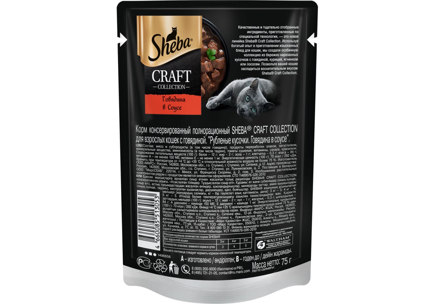 Рекомендуемое количество корма SHEBA® (вес животного, кг – упаковок корма в сутки, шт): 3 кг – 3; 4 кг – 4; 5 кг – 5. Вашего питомца следует кормить кормом комнатной температуры.