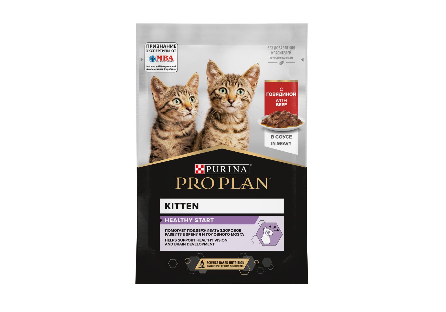 Команда квалифицированных ветеринарных специалистов разработала влажный корм PURINA® PRO PLAN® HEALTHY START для здорового развития котенка. Этот полнорационный корм для кошек с говядиной подходит для повседневного кормления питомцев в возрасте до 12 месяцев, а также беременных и кормящих кошек.