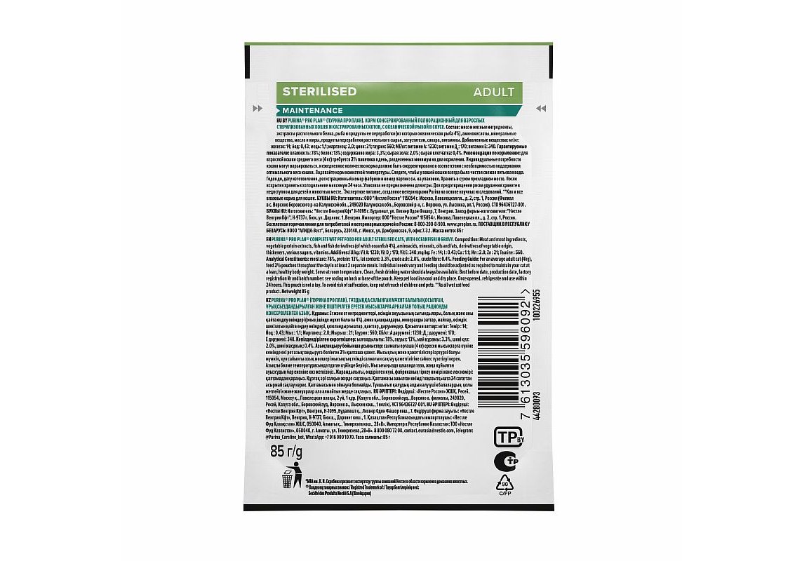 Команда квалифицированных ветеринарных специалистов разработала влажный корм PURINA® PRO PLAN® STERILISED MAINTENANCE для взрослых стерилизованных кошек. Этот полнорационный корм для кошек с океанической рыбой подходит для ежедневного кормления и полностью удовлетворяет индивидуальные потребности организма стерилизованных питомцев.