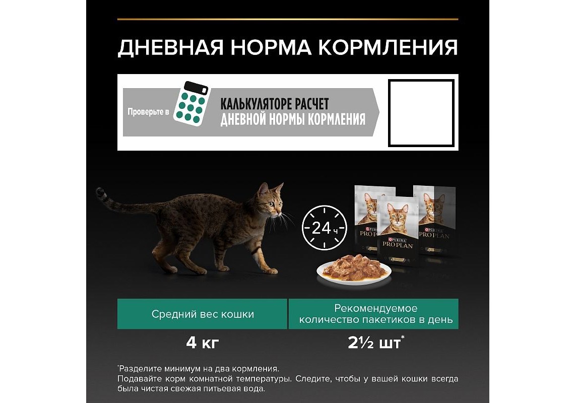 Рекомендации по кормлению: Для взрослой кошки среднего веса (4 кг) требуется 3 пакетика в день, разделенных минимум на два кормления. Индивидуальные потребности кошки могут варьироваться, и ежедневное количество корма должно быть скорректировано в соответствии с необходимостью поддержания оптимального веса кошки. Подавайте корм комнатной температуры. Следите, чтобы у вашей кошки всегда была чистая свежая питьевая вода.