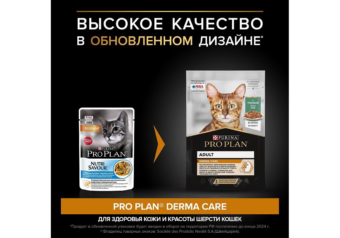 Влажный корм для кошек PURINA® PRO PLAN® DERMA CARE (Забота о здоровье кожи и шерсти) — это полюбившийся PRO PLAN® NUTRISAVOUR® ELEGANT с новым названием, но с прежним составом и качеством.