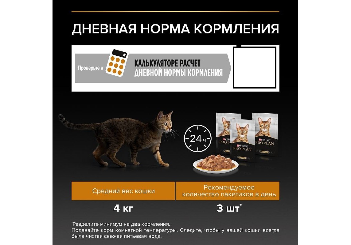 Для взрослой кошки среднего веса (4 кг) требуется 3 пакетика в день, разделенных минимум на 2 кормления. Индивидуальные потребности кошки могут варьироваться, и ежедневное количество корма должно быть скорректировано в соответствии с необходимостью поддержания оптимального веса кошки. Подавайте корм комнатной температуры. Следите, чтобы у вашей кошки всегда была чистая свежая питьевая вода.
