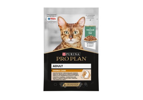 PRO PLAN DERMA CARE Влажный корм Паучи ПРО ПЛАН для взрослых кошек Для здоровья кожи и шерсти с Треской в соусе (цена за упаковку) 85г х 26шт