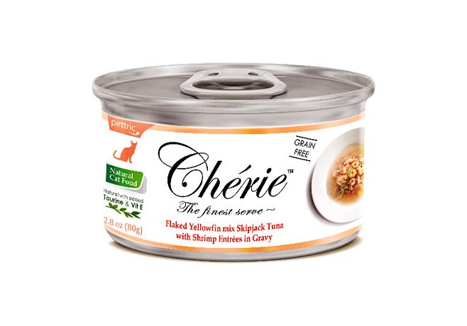 Pettric Cherie Grain free Flaked Yellowfin mix Longtail Tuna & Shrimp Entrees in gravy Беззерновые консервы Петрик для кошек Тунец с креветками в подливе (цена за упаковку) 80г х 24шт