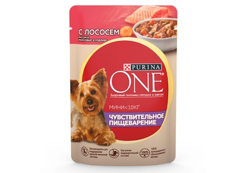PURINA ONE MINI Влажный корм Паучи Пурина УАН для взрослых собак мелких пород при чувствительном пищеварении с лососем (цена за упаковку) 85г х 26шт