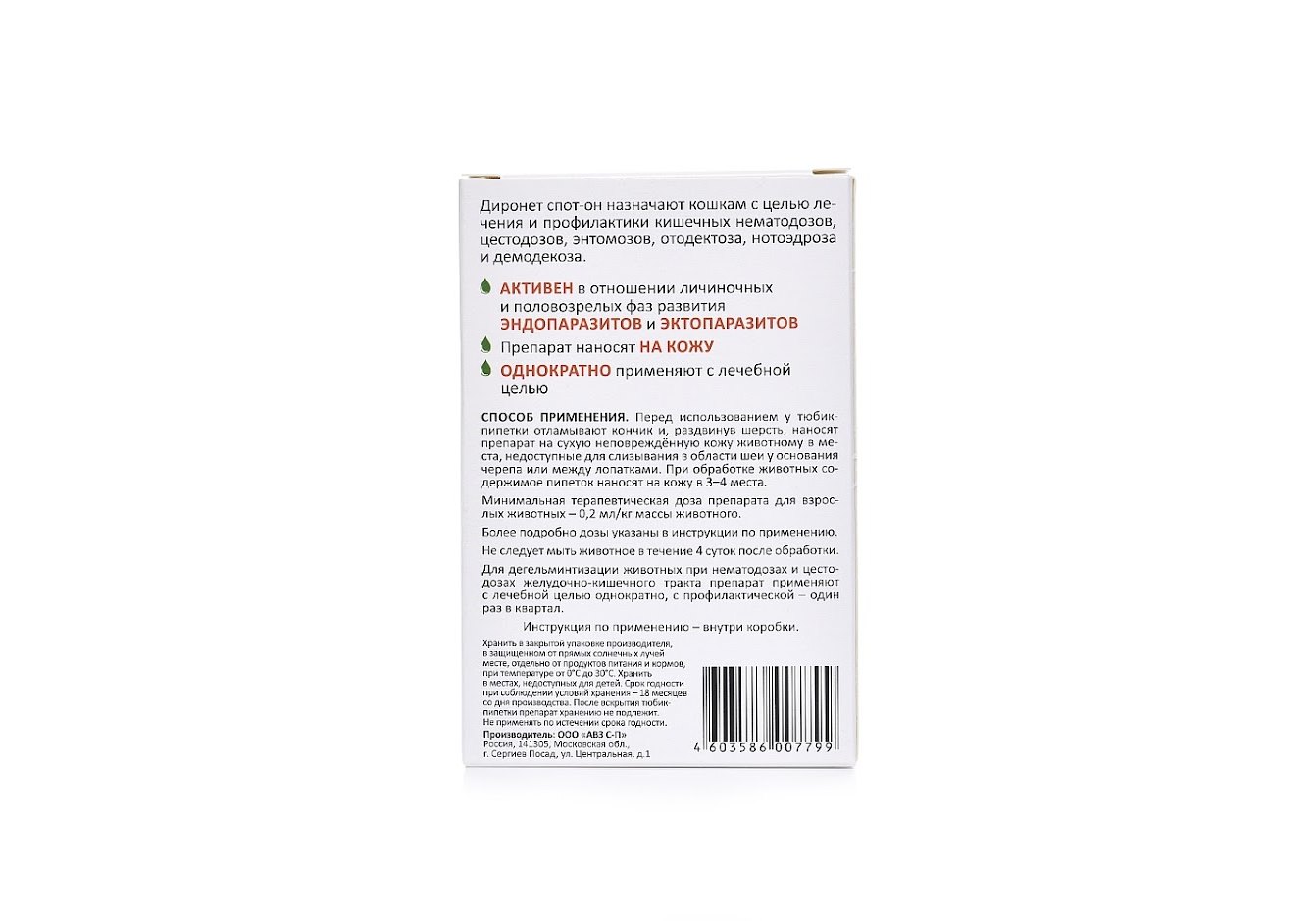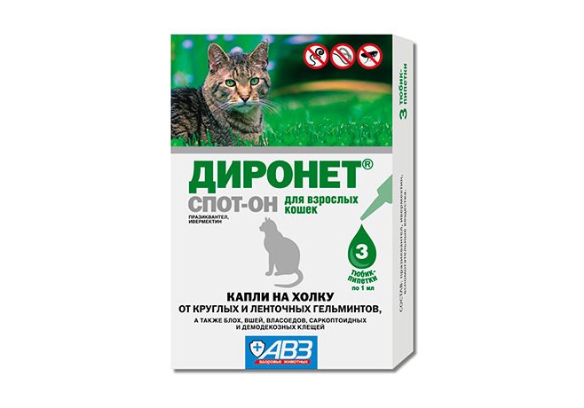 «Диронет спот-он» назначают взрослым кошкам с целью лечения и профилактики кишечных нематодозов, цестодозов, энтомозов, отодектоза, саркоптоза, нотоэдроза и демодекоза.
