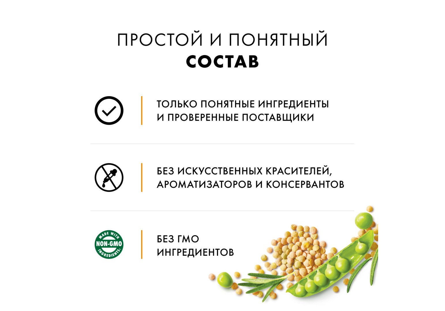 Курица (27%): дегидратированный белок курицы, свежая курица (7%); дегидратированный белок домашней птицы (индейка, гусь, утка), гороховый крахмал (19%), куриный жир, гороховый белковый концентрат (9%), высушенная мякоть сахарной свеклы (4%), тапиоковый крахмал, гидролизат из печени индейки, минеральные вещества, высушенная люцерна, подсолнечное масло, экстракт цикория, экстракт розмарина (0,01%).