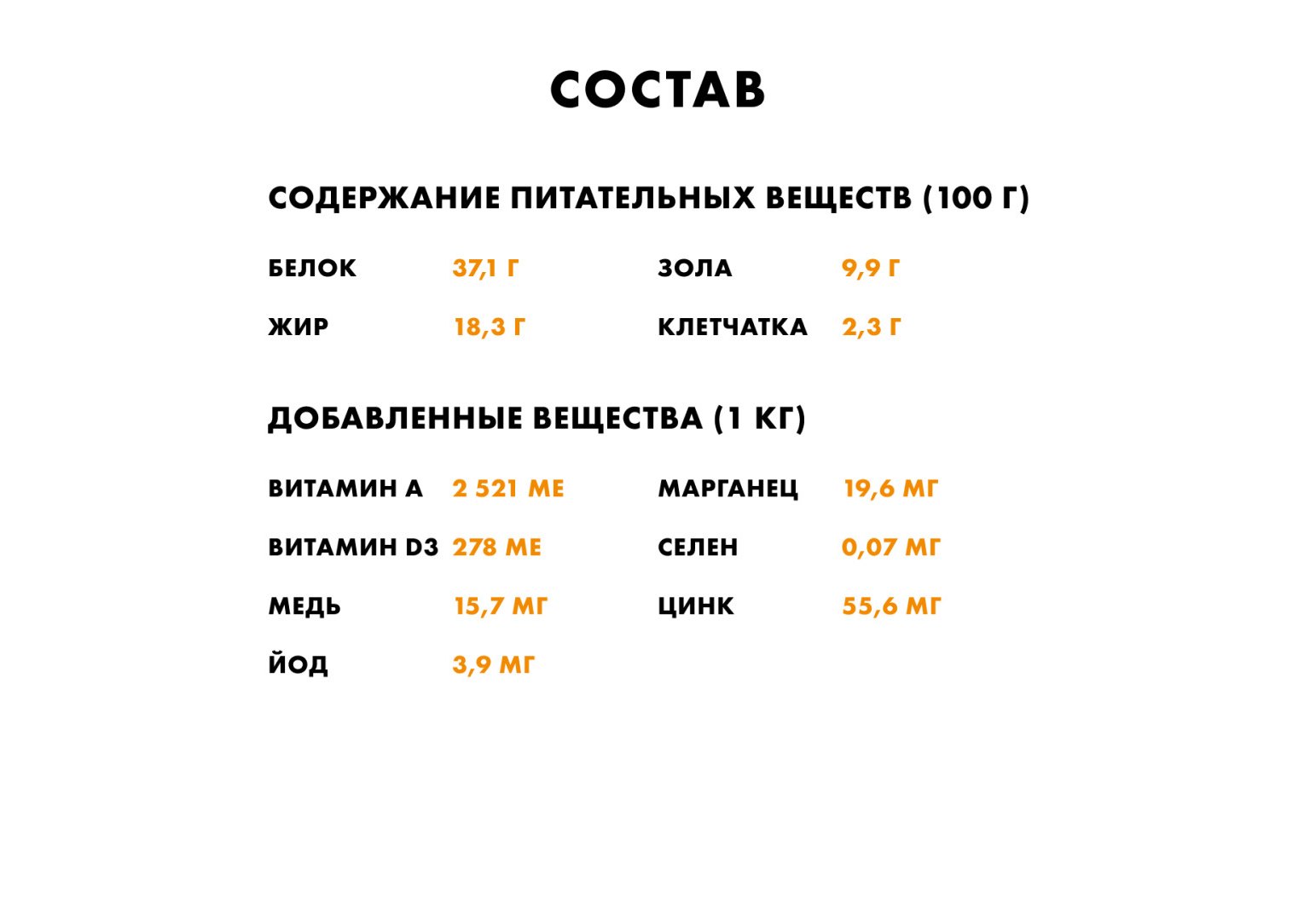 Белок – 37,1 г; жир – 18,3 г; зола – 9,9 г; клетчатка – 2,3 г.