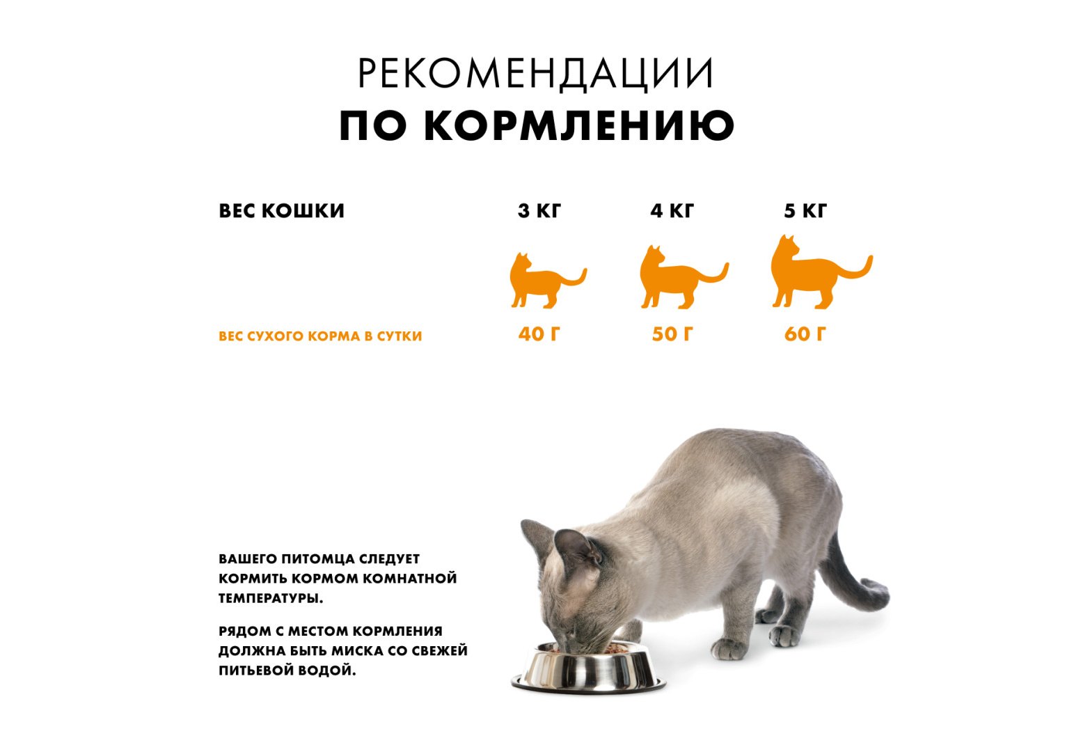 При массе кошки 4 кг рекомендуемое количество упаковок сухого корма в сутки – 50 г.