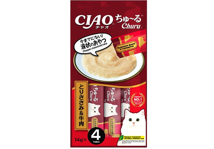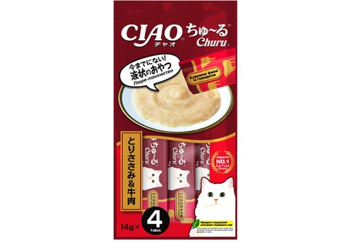 Inaba Ciao Churu Лакомство-пюре Инаба для кошек Куриное филе и говядина 14г х 4шт