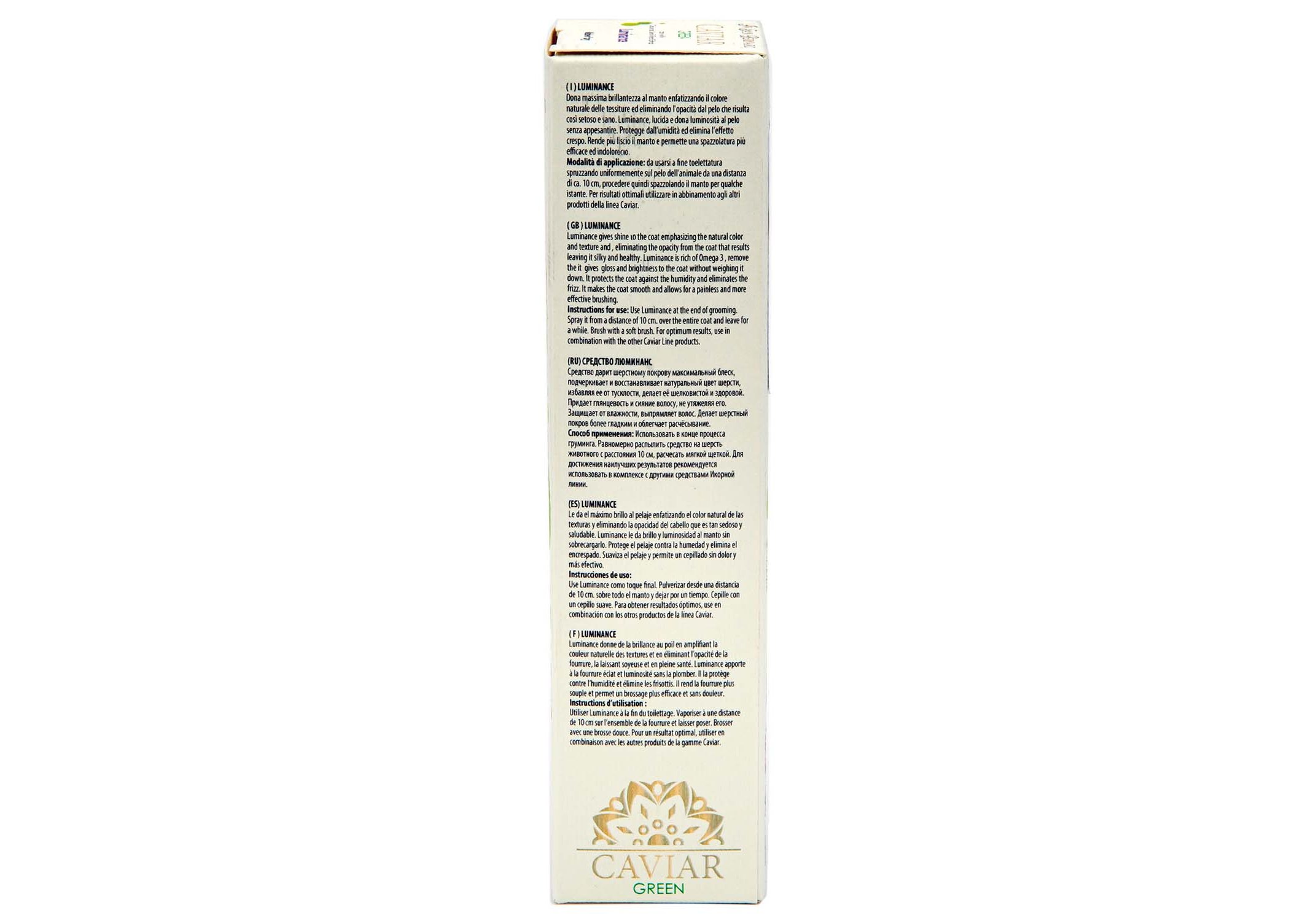 Средство для собак и кошек с любым типом шерсти для мгновенного придания шерстному покрову безупречного вида. Восстанавливает волос и интенсивно его увлажняет по всей длине, подчеркивает натуральный цвет шерсти, избавляет от тусклости, делает ее гладкой, шелковистой, блестящей и здоровой. Придает шерстному покрову максимальный блеск и обогащает натуральный цвет шерсти. Защищает от влажности и оказывает выпрямляющий эффект, облегчает расчёсывание. Незаменимо в период подготовки к выставке. Не требует смывания. Для достижения наилучшего результата рекомендуется применять в комплексе с другими продуктами линии ISB Green Caviar.