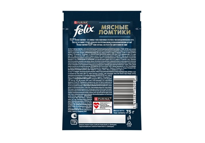 Эксперты Purina, разрабатывая влажные корма для домашних любимцев, создали корм для взрослых кошек Felix «Мясные ломтики» — специально для Вашего любителя мяса. Влажный корм для кошек Felix сбалансирован и удовлетворяет все потребности Вашего питомца в витаминах и минеральных веществах, а также дает возможность сполна насладиться невероятным вкусом.