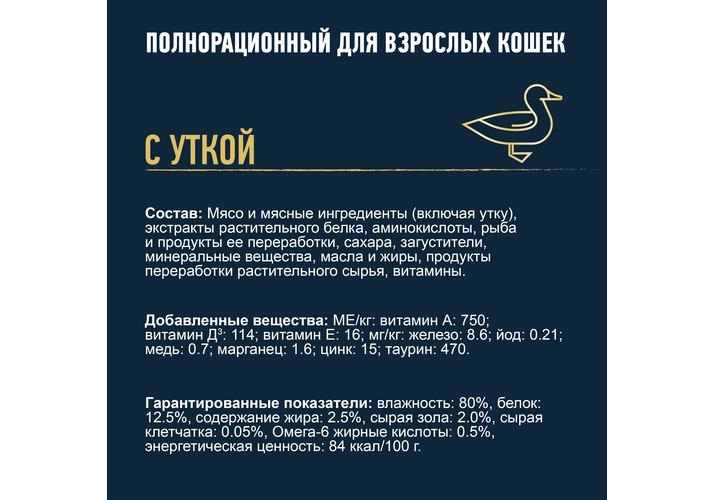 Мясо и мясные ингредиенты (включая утку), экстракты растительного белка, аминокислоты, рыба и продукты ее переработки, сахара, загустители, минеральные вещества, масла и жиры, продукты переработки растительного сырья, витамины.