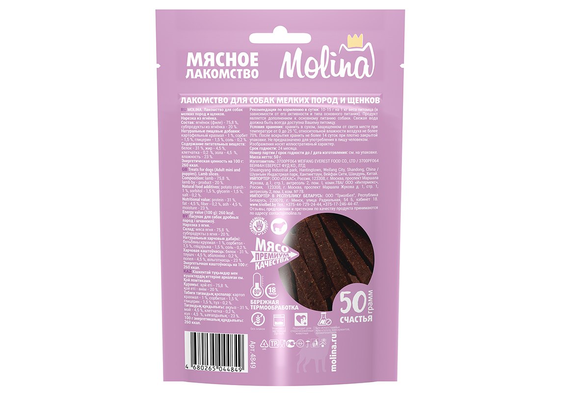 Molina Мясное лакомство Молина для Щенков и собак Мелких пород Нарезка из Ягненка 50 г