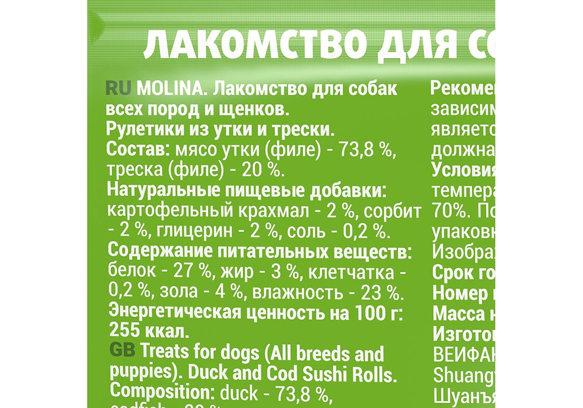 • ингредиенты, входящие в состав корма Molina, сертифицированы как пригодные для питания человека и производятся на территории ЕС.