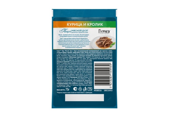 Гурмэ Перл Влажный корм Паучи Пурина Гурмэ Перл Мясной Дуэт для взрослых кошек с курицей и кроликом (цена за упаковку) 75г х 26шт