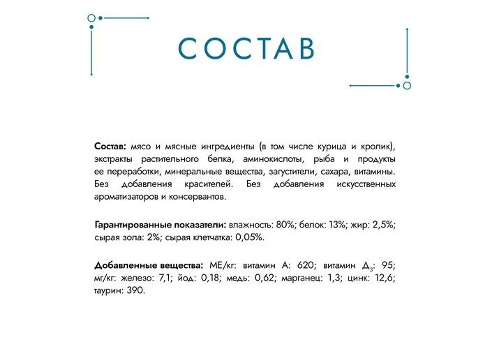 Добавленные вещества: МЕ/кг: витамин А: 620; витамин Д3: 95; мг/кг: железо: 7,1; йод: 0,18; медь: 0,62; марганец: 1,3; цинк: 12,6; таурин: 390.