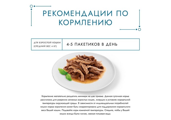 Для взрослой кошки среднего веса (4 кг) требуется 3-4 пакетика в день. Кормление желательно разделить минимум на два приема. Данная суточная норма рассчитана для умеренно активных взрослых кошек, живущих в условиях нормальной температуры окружающей среды. В зависимости от индивидуальных потребностей кошки норма кормления может быть скорректирована для поддержания нормального веса Вашей кошки. Следите, чтобы у Вашей кошки всегда была чистая, свежая питьевая вода.