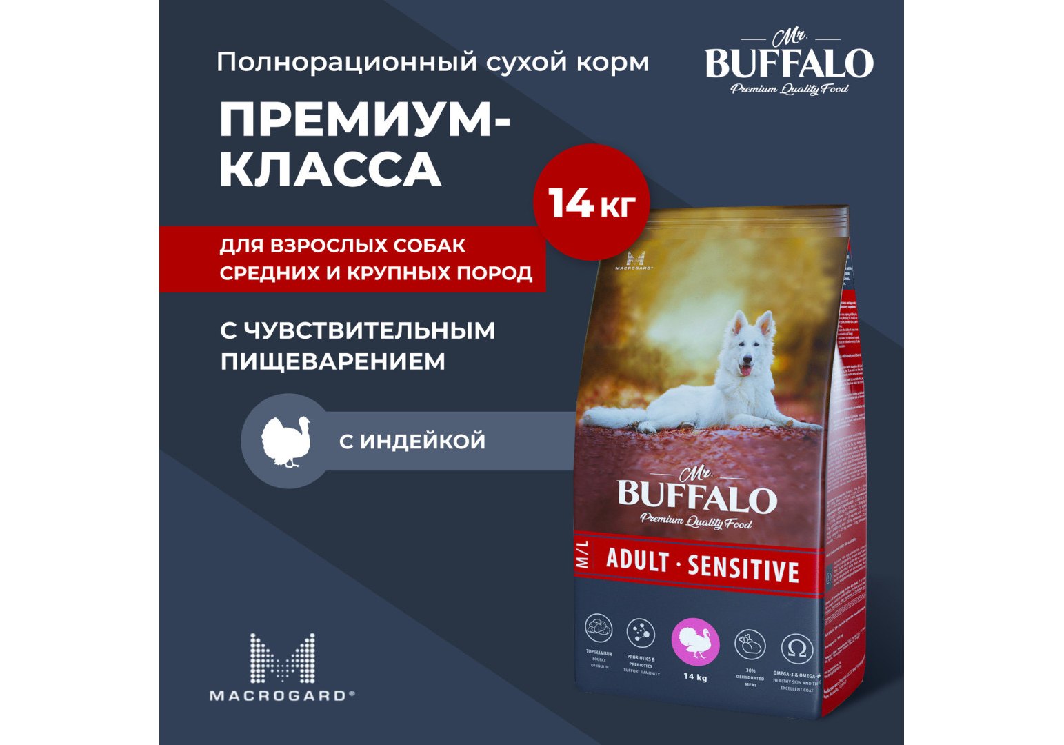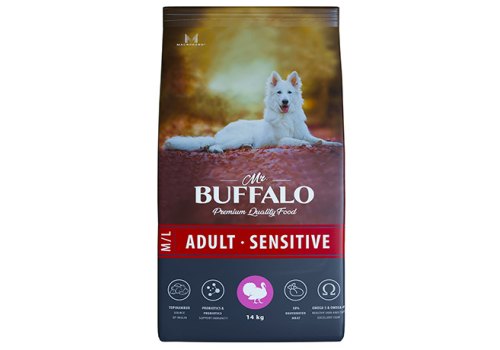 Mr.Buffalo Adult M L Sensitive Сухой корм Мистер Бафало для собак Средних и Крупных пород с Чувствительным пищеварением Индейка 14 кг