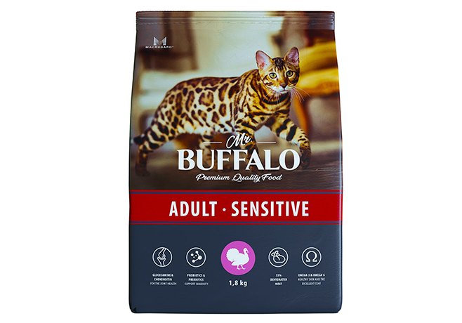 Полнорационный сухой корм Mr.Buffalo ADULT SENSITIVE с индейкой для взрослых кошек и котов с чувствительным пищеварением или привередливых в еде. Рацион удовлетворяет жизненные потребности взрослой кошки, обеспечивает крепкое здоровье и отличный внешний вид, способствует профилактике распространённых заболеваний, укрепляет иммунную систему животного. Индейка — диетическое и гипоаллергенное мясо птицы, обладающее прекрасной усвояемостью и содержанием питательных веществ. Мясо индейки содержит в большом количестве такие витамины, как А и Е.