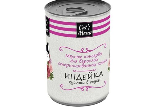 Главная////Для Cats Menu/Для взрослых кошек/Влажный корм Банки/Cats Menu / Консервы Кэтс Меню для взрослых Стерилизованных кошек Индейка кусочки в соусе (цена за упаковку)