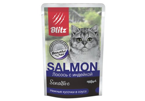 Blitz Sensitive Beautiful Hair Salmon Паучи Блиц для взрослых кошек Лосось с Индейкой (цена за упаковку) 85г х 24шт