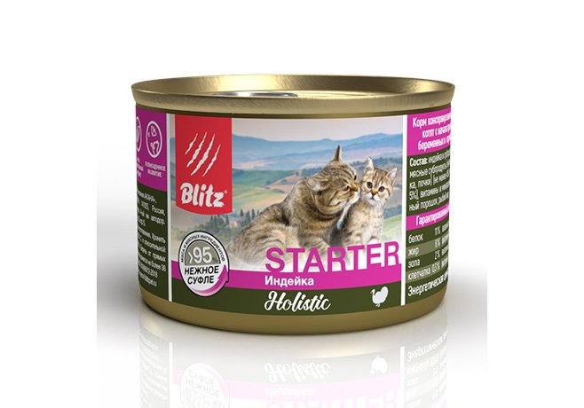 Blitz Holistic Starter Консервы Блиц для Котят беременных и кормящих кошек нежное Суфле Индейка (цена за упаковку) 200г х 24шт