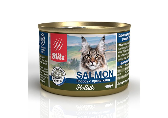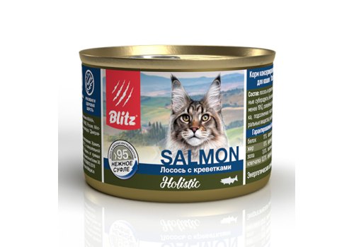 Blitz Holistic Salmon Консервы Блиц для взрослых кошек нежное Суфле Лосось с Креветками (цена за упаковку) 200г х 24шт