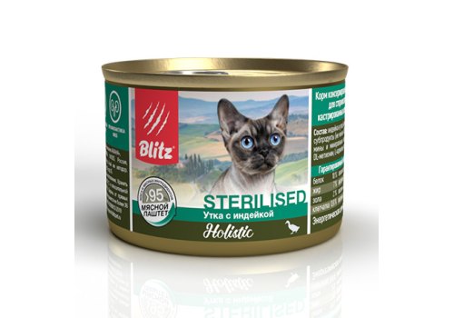 Blitz Holistic Sterilised Консервы Блиц для Стерилизованных кошек и Кастрированных котов мясной Паштет Утка с Индейкой (цена за упаковку) 200г х 24шт