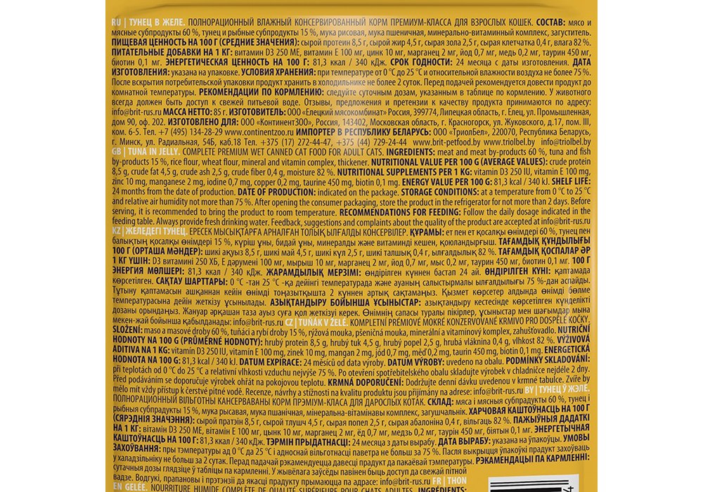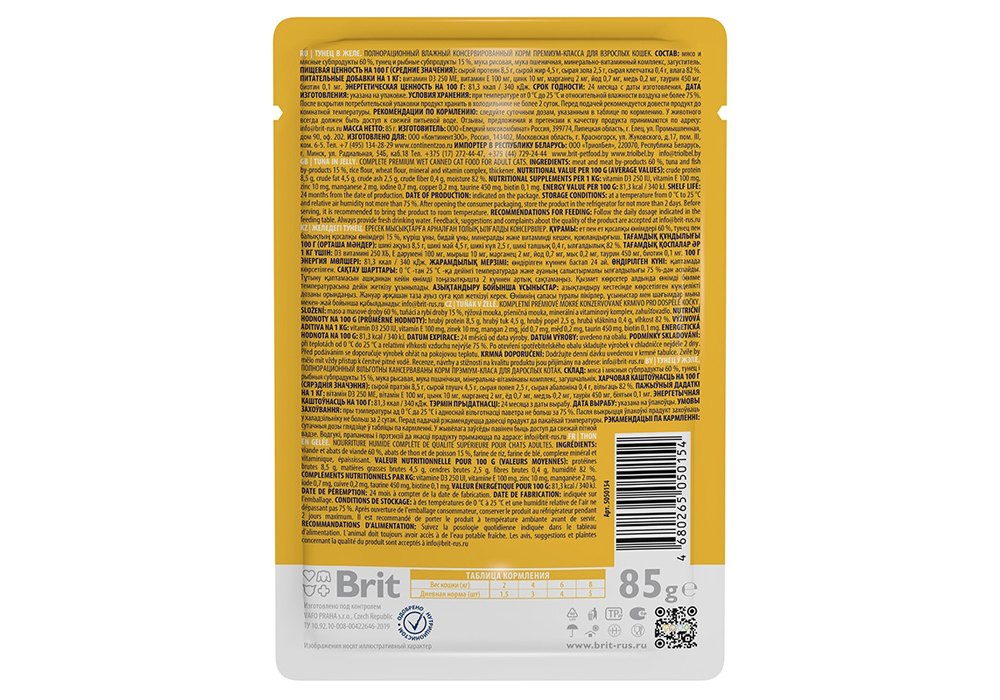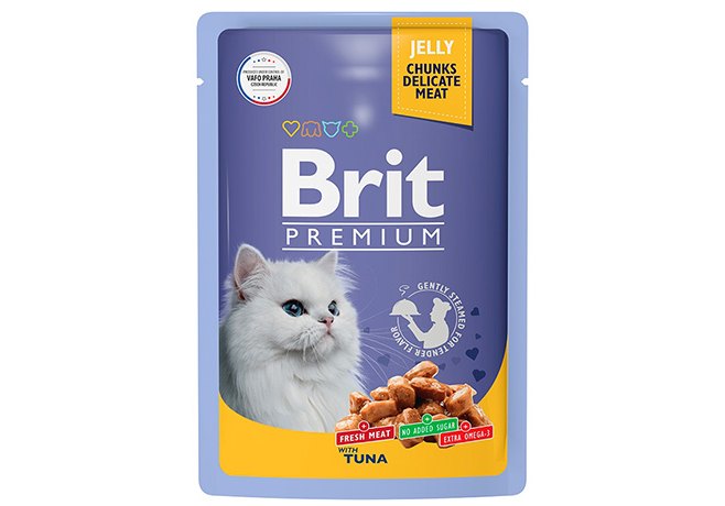 Полнорационный влажный корм премиум класса для взрослых кошек Brit Premium тунец в желе.