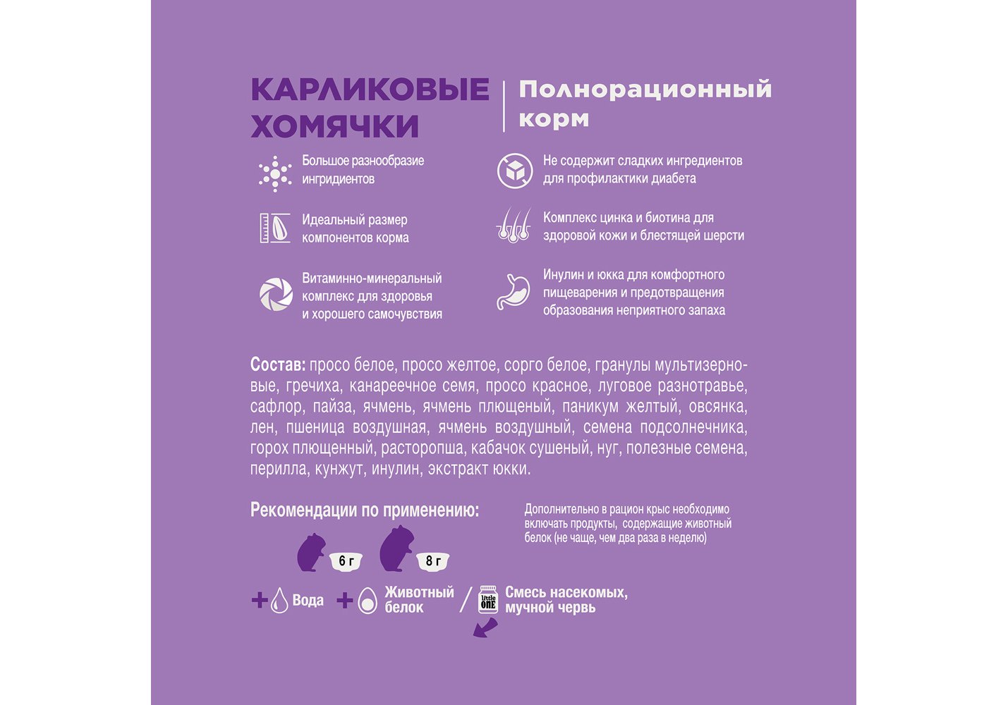 Полнорационный корм с добавлением витаминов и минеральных веществ, сбалансированный в соответствии с индивидуальными пищевыми потребностями хомячков карликовых видов. Отличается очень разнообразным составом, но при этом не содержит сладких ингредиентов для профилактики диабета. Не содержит острых компонентов, а каждый ингредиент тщательно подобран с учетом размера питомцев.