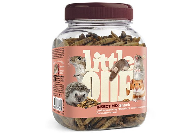 Смесь насекомых является вкусным и питательным дополнительным кормом для всеядных грызунов, а также ценным источником важных макро- и микронутриентов. Ее состав идеально сбалансирован и включает в себя сушеные куколки тутового шелкопряда, личинки мухи чёрной львинки, мучных червей и сверчков. Благодаря входящим в состав насекомым cмесь является ценным источником животного белка, необходимого в рационе всеядных грызунов, а также полезных жирных кислот, которые благотворно влияют на состояние кожи и шерсти питомца.