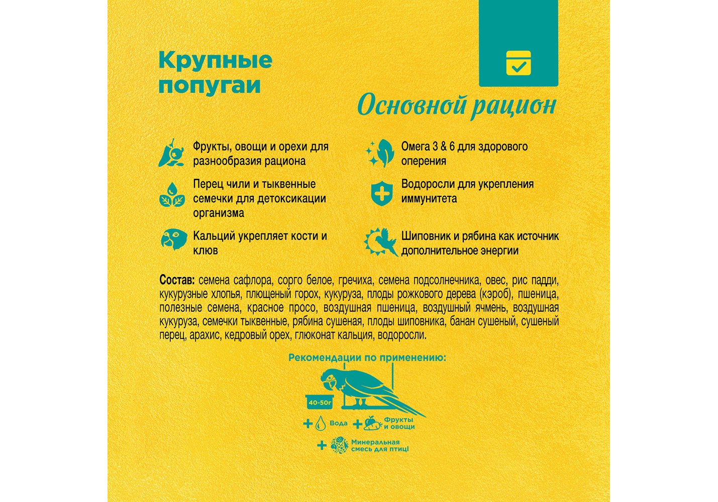 Корм для ежедневного кормления крупных попугаев: амазонов, жако, какаду, ара и других. Состав корма включает в себя любимые крупными попугаями ингредиенты, среди которых воздушные зерна, сушеные фрукты, овощи и орехи, редкие плоды и ягоды. Их разнообразие обеспечит птицу всеми необходимыми питательными веществами. В корм добавлен перец чили – особое лакомство для крупных видов попугаев, который, как и тыквенные семечки в составе, отвечает за детоксикацию организма.