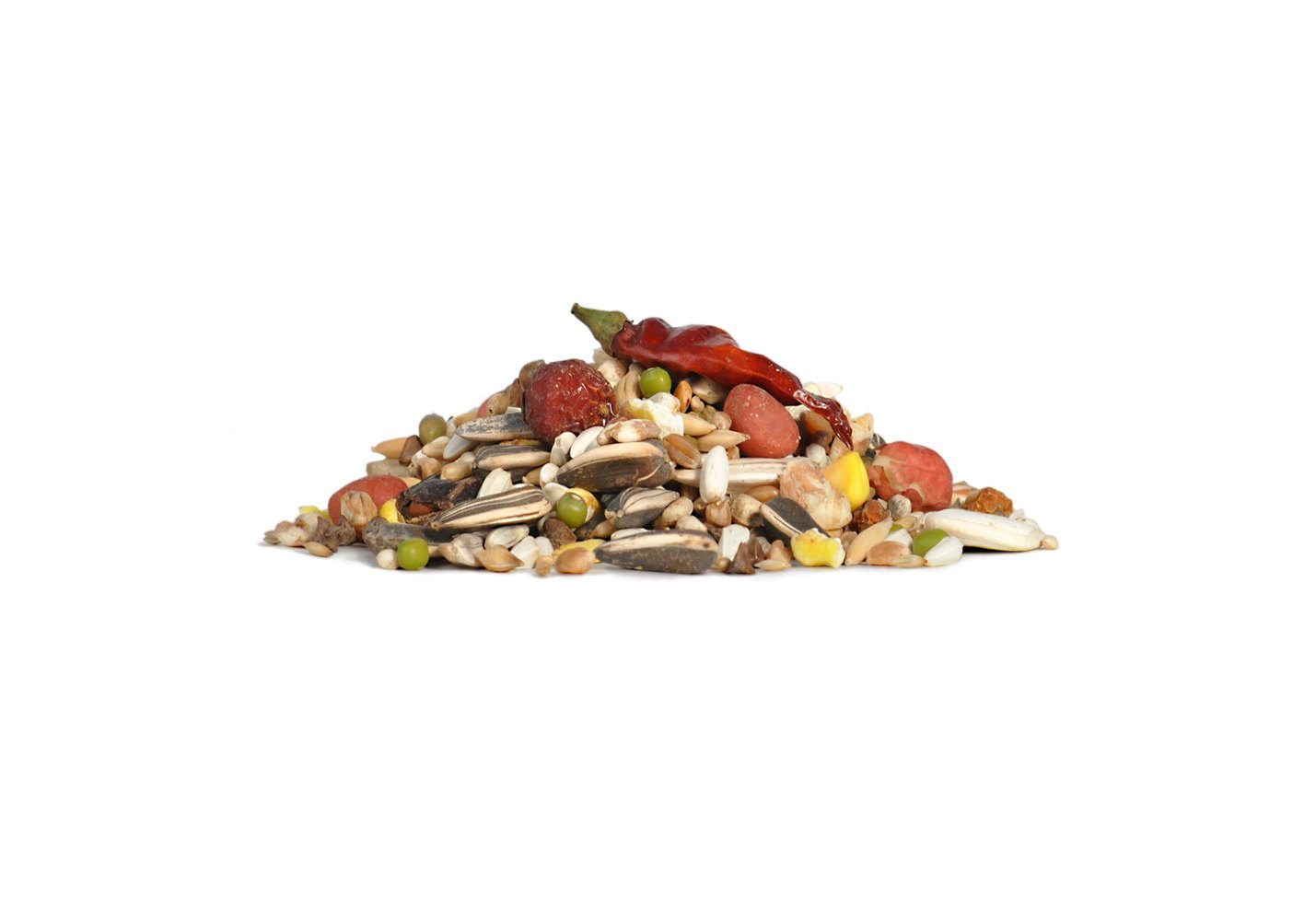 Семена сафлора, сорго белое, гречиха, семена подсолнечника, овес, рис падди, кукурузные хлопья, плющеный горох, кукуруза, кэроб, пшеница, полезные семена, красное просо, воздушная пшеница, воздушный ячмень, воздушная кукуруза, семечки тыквенные, рябина сушеная, плоды шиповника, банан сушеный, сушеный перец, арахис, кедровый орех, глюконат кальция, водоросли.
