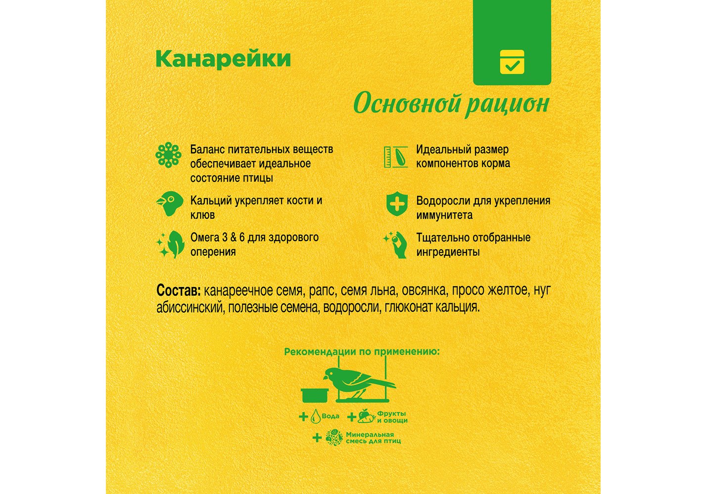 Сбалансированный корм для ежедневного кормления канареек. В состав входят полезные и любимые канарейками зерна и семена, среди которых канареечное семя – естественная пища канареек, а также просо, рапс, абиссинскиий нуг и семена льна. Корм дополнительно обогащен кальцием для крепких костей и клюва, а также водорослями для поддержания иммунитета.