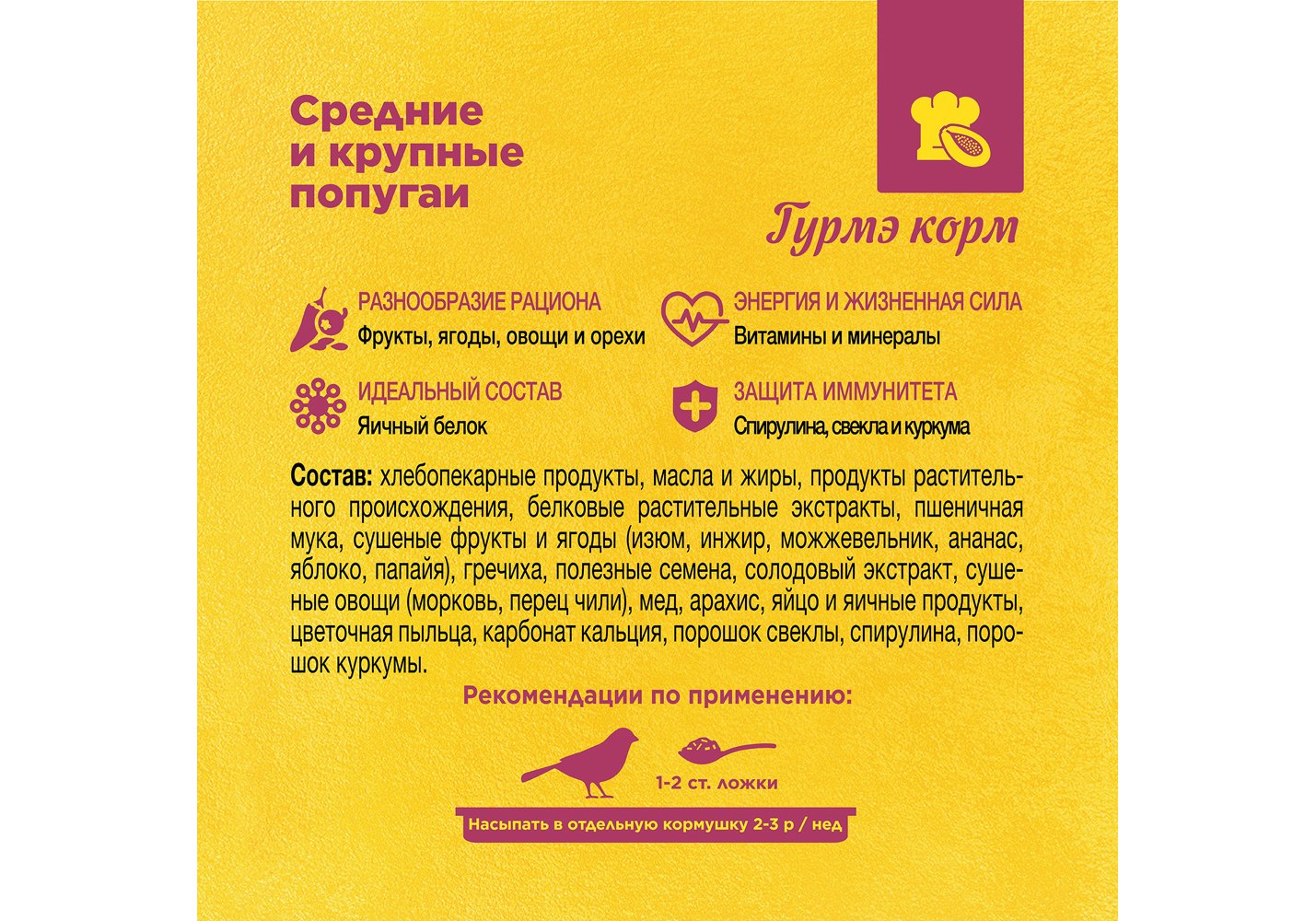 Крупные кусочки корма хрустящей консистенции непременно оценят средние и крупные попугаи. Входящие в состав фрукты, ягоды, овощи и орехи обеспечат разнообразие рациона птицы. Яичный белок способствует поддержанию организма птицы в идеальном состоянии, а витамины и минералы служат источниками дополнительной энергии и жизненных сил. Перец чили, спирулина и корень куркумы придают отдельным кусочкам привлекательный цвет и делают их особенно вкусными для средних и крупных попугаев.