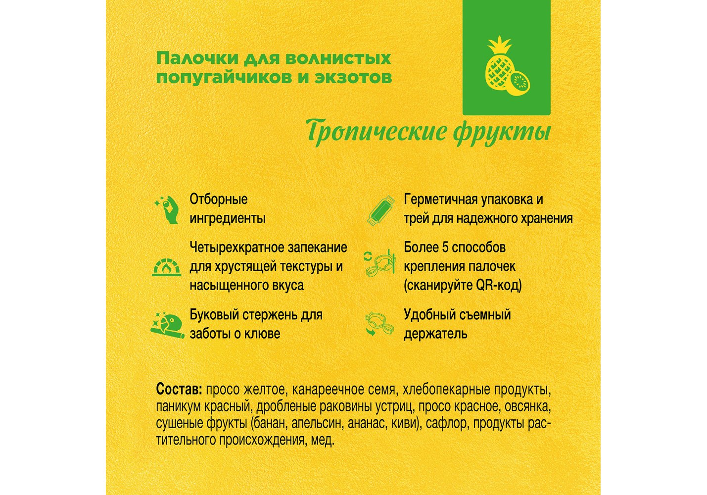 Палочки для волнистых попугайчиков и экзотов с тропическими фруктами содержат отборные ингредиенты и помогают разнообразить рацион питомца. Для хрустящей консистенции палочки выпекаются в печах по технологии бережного запекания, которая сохраняет все полезные свойства продукта. Основа лакомства - буковый стержень, который служит отличным инструментом для стачивания клюва. Палочки могут занять питомца на долгое время, а также станут удобным инструментом для игр и дрессировки.